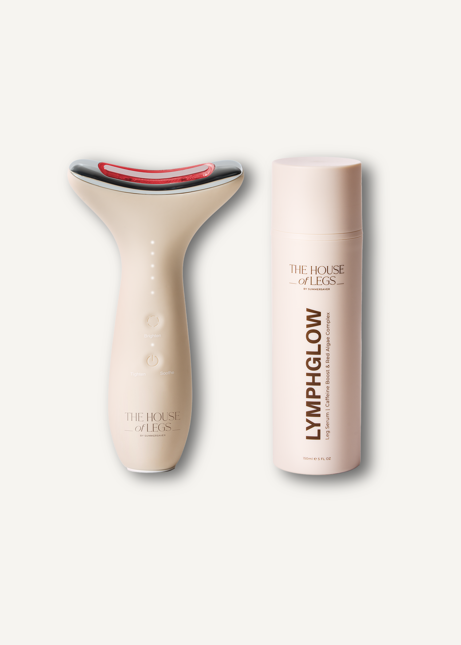The Light Leg Starter Kit from The House of Legs is your perfect entry-level combination for lighter legs , visible decongestion , and smoother skin . The set combines the Lymphglow Leg Serum with the innovative EMS & Light Therapy Device – for a 2-in-1 skincare routine that activates lymphatic drainage , reduces water retention , and noticeably firms and tones the skin on your legs.